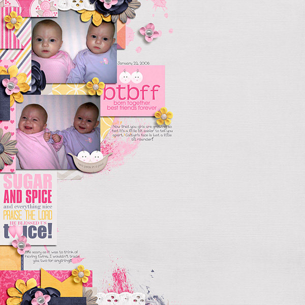 This mini includes 5 Patterned Papers Created at 300 dpi and saved as .jpeg files and 15 Unique Elements created at 300 dpi and saved as .png files Including two peas in a pod, twin title work, wordart, ribbons, bows, leaves, flowers and more! Take a look at the page Brie Created with it!